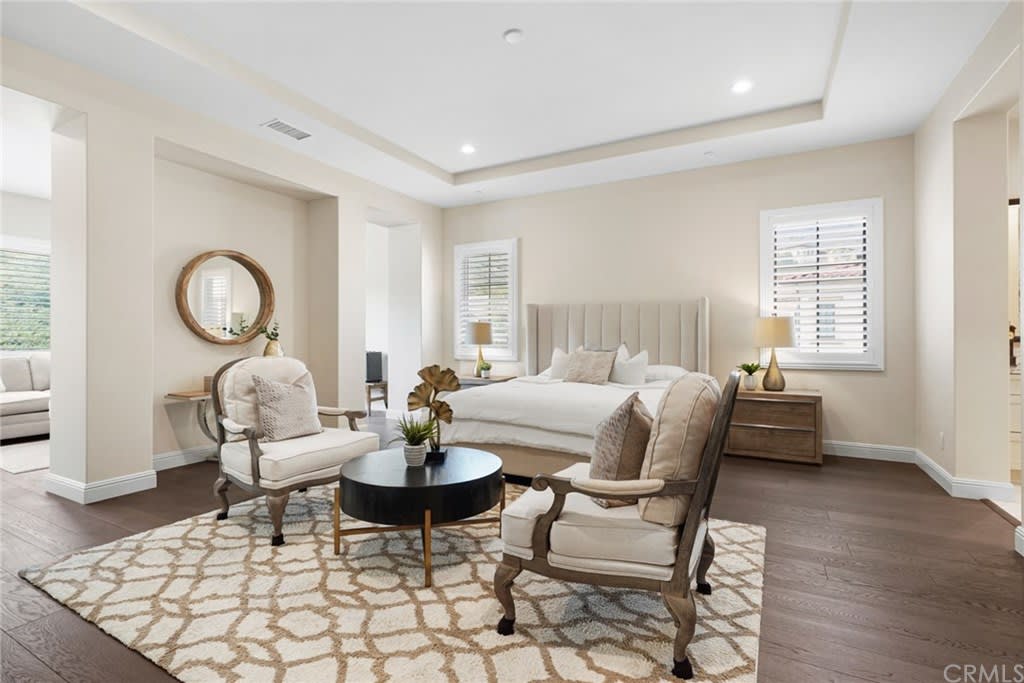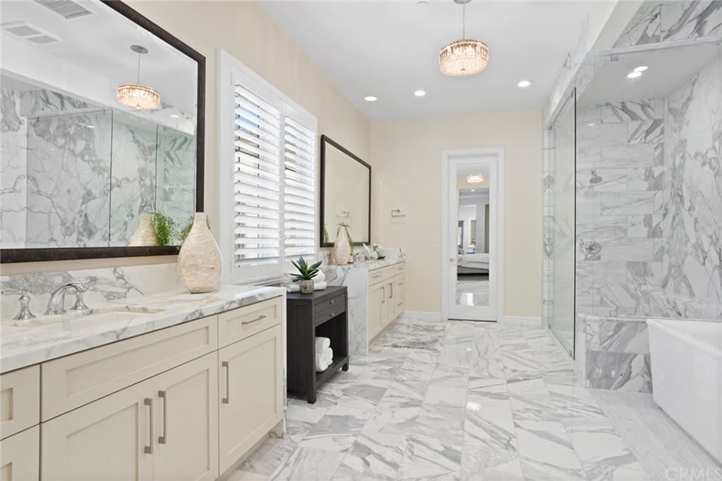 Behind the guard gated community of The Groves at Orchard Hills, sits the hilltop Vistas. This Tacara home is truly one of a kind with a thoughtfully designed resort inspired backyard on a 11,000+ square feet lot with hillside sunset views. Your private backyard features a grand custom pool with an infinity hot tub at the center, swim-up bar, outdoor shower, covered area with Barbecue, dinging room, firepit, and putting green. Enter through a grand foyer with Toll Brother's signature dual staircase. Open-concept Great Room with floor to ceiling pocket sliding doors from living room, dining room, and kitchen. Gourmet kitchen is every home chef's dream with top of the line stainless steel Wolf and Sub-zero appliances, back-kitchen with an additional cook-top, sink, built-in refrigerator, and walk-in pantry. Other stunning kitchen features include dual islands, custom designer backsplash, and top of the line quartz countertops. First floor features large mainfloor bedroom with en-suite bathroom, powder room, and den (perfect for a home office, home gym, or music room). Upstairs you will find a large loft, 3 secondary bedrooms each with its own en-suite bathroom, and Master Suite. This exquisite Master suite features it's own separate retreat, large walk-in closet connected to the laundry room, and en-suite bathroom. Master bathroom features a large walk-in shower, soaking tub, and dual vanity sinks, all designed with floor to ceiling slabs and cascading waterfalls off the vanities.