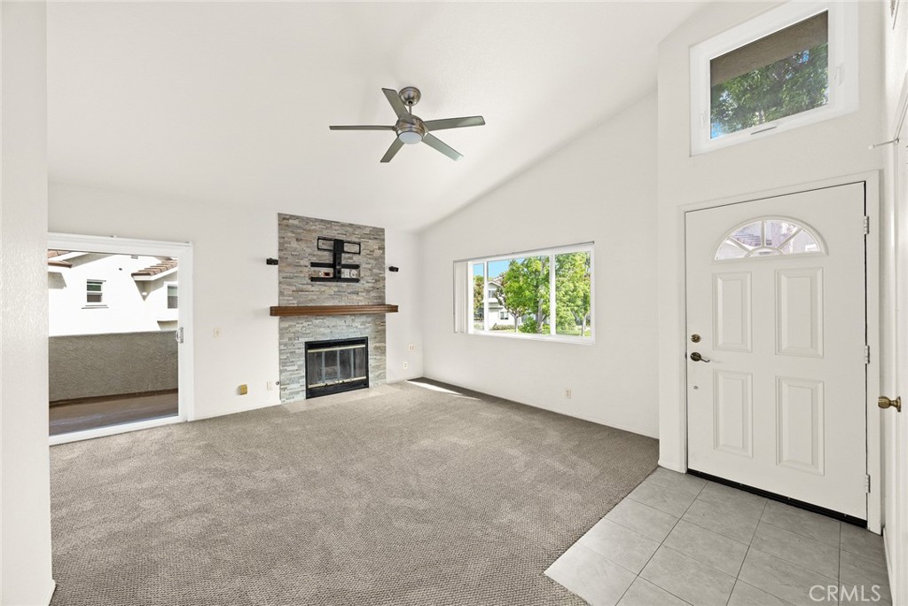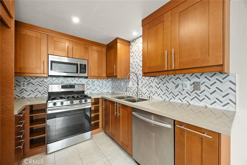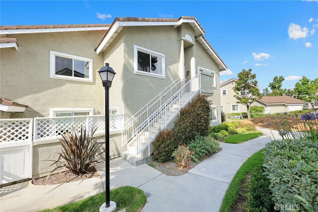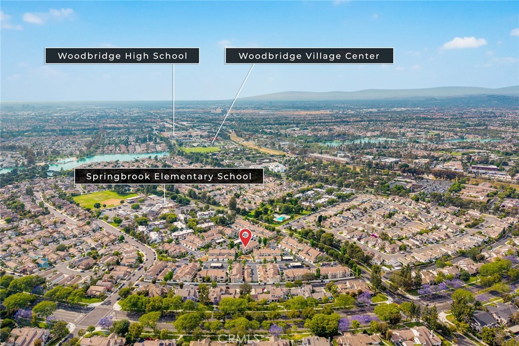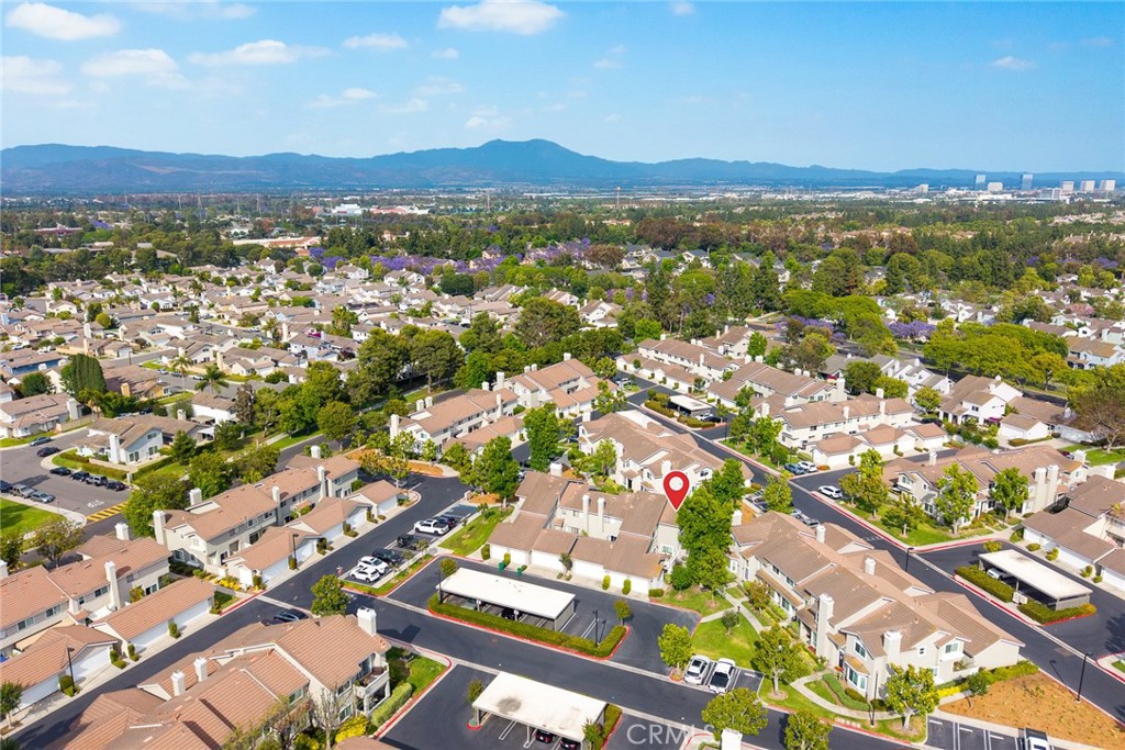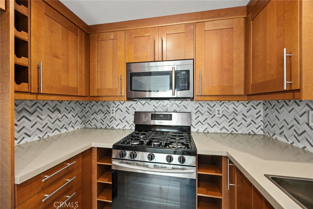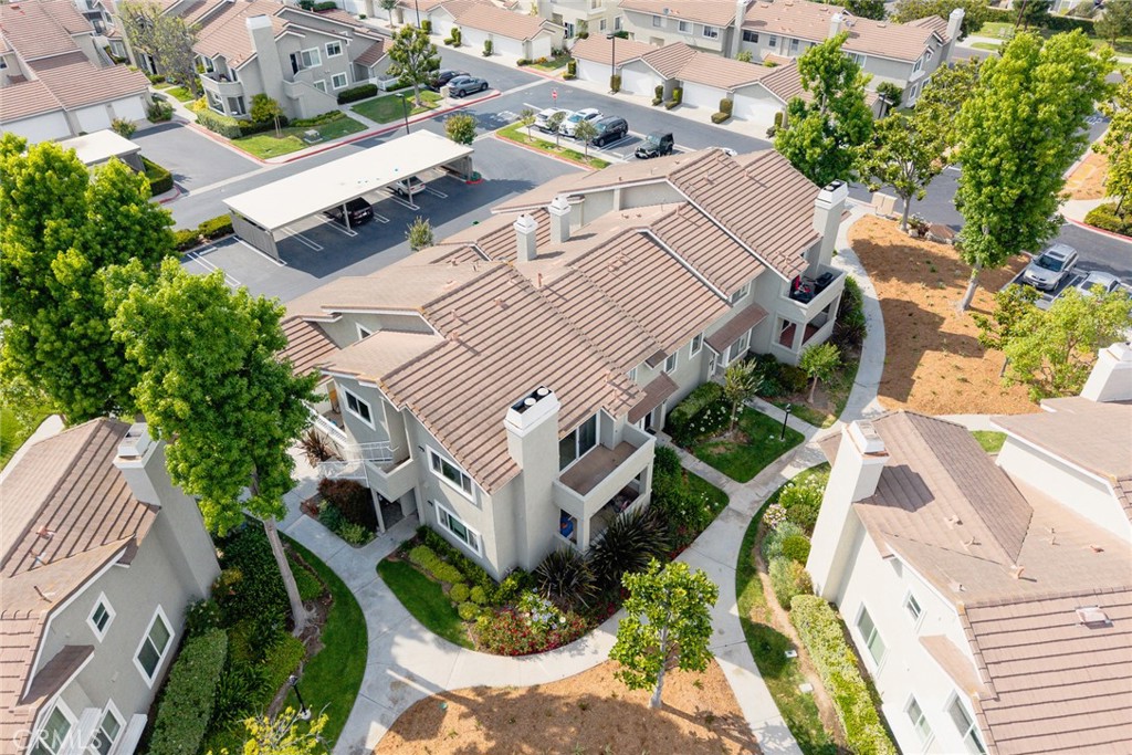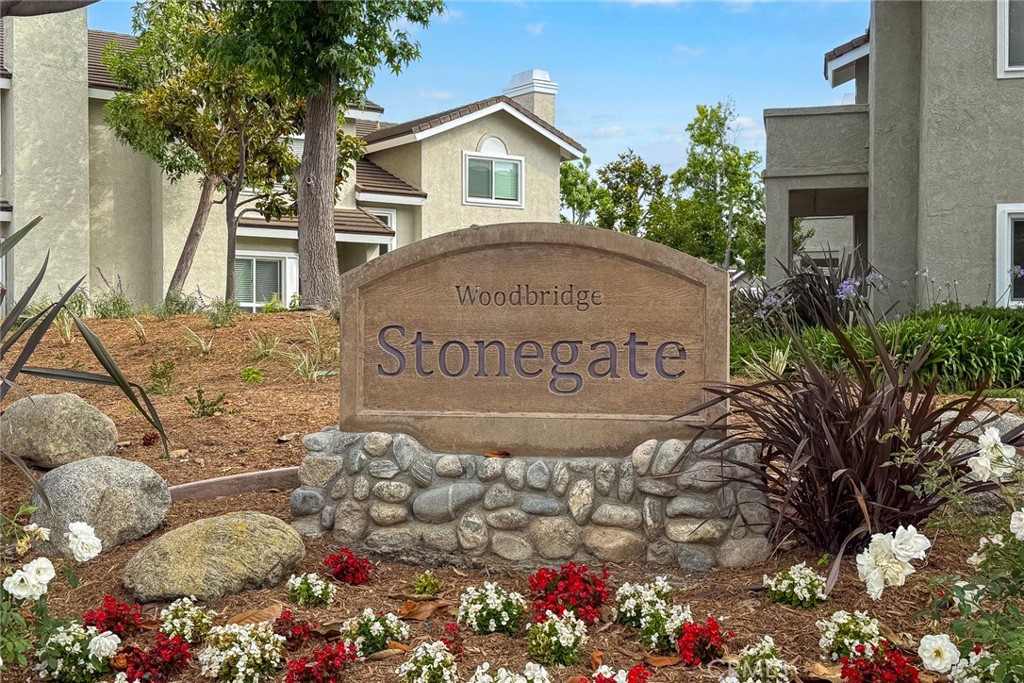 Welcome to Stonegate, located in the highly sought-after Woodbridge community of Irvine. This rare corner-unit Auburn model is bright and airy with beautiful greenbelt and treetop views from every room. Step into the spacious living room featuring vaulted ceilings and a cozy stone fireplace, flowing seamlessly into the formal dining area, which opens to a generous private balcony--perfect for relaxing or entertaining with stunning scenic views. The chef's kitchen is a standout, boasting custom cabinetry, quartz countertops, stylish tiled walls, stainless steel accents, and a host of thoughtful upgrades. The bedroom wing includes a dedicated laundry closet with side-by-side washer/dryer hookups. A remodeled bathroom showcases marble countertops, a custom vanity, and a private shower with stone and tile detailing, a custom showerhead, and a sleek sliding glass door. The primary bedroom is spacious, featuring vaulted ceilings, a ceiling fan, and an entire mirrored wardrobe wall. The second bedroom, ideal for guest or home office. Additional highlights include central air, a private garage (#549) with remote access, and a covered parking spot (#72), plus ample guest parking nearby. Enjoy all the award winning schools and the amenities of Woodbridge: scenic walking trails, lush parks, sparkling pools and spas, top-rated schools, and a wide range of sports facilities including tennis, volleyball, basketball, and handball courts. Plus, the community's stunning lake with mountain views adds a resort-style feel to everyday living.