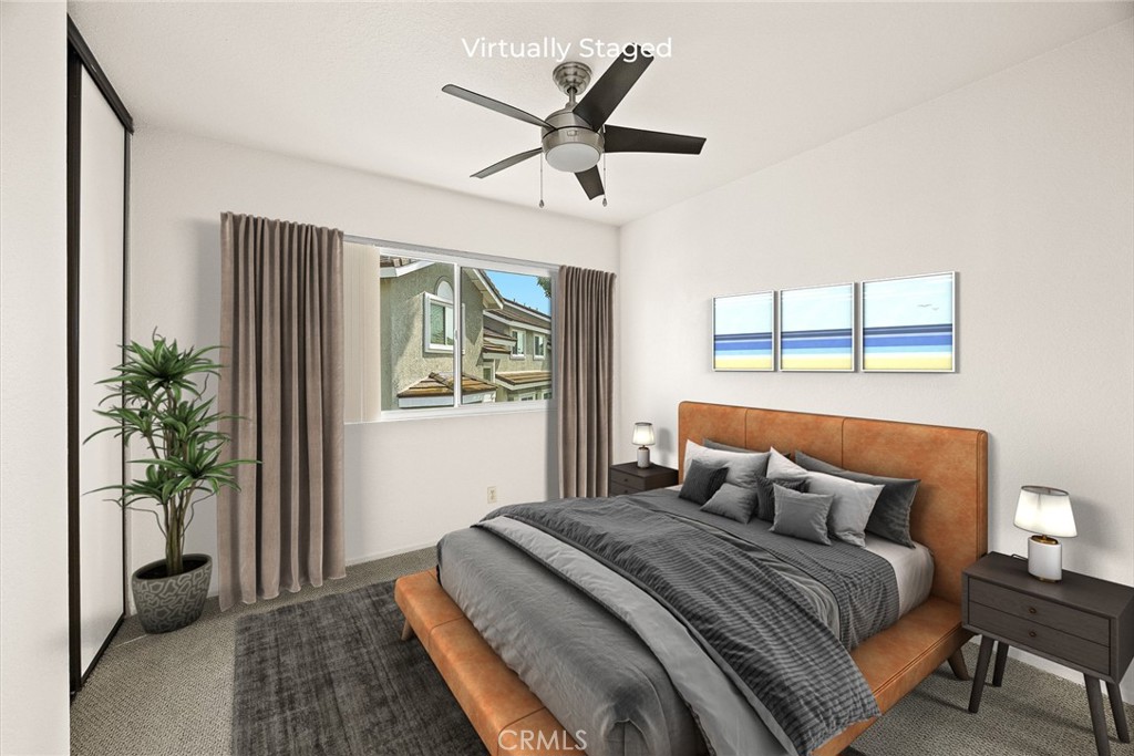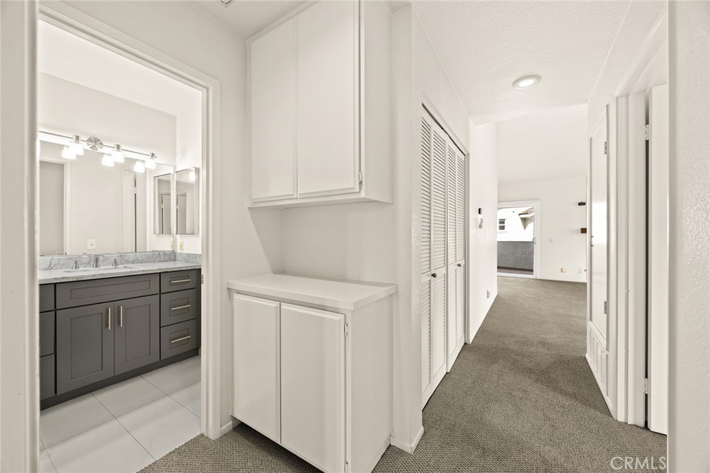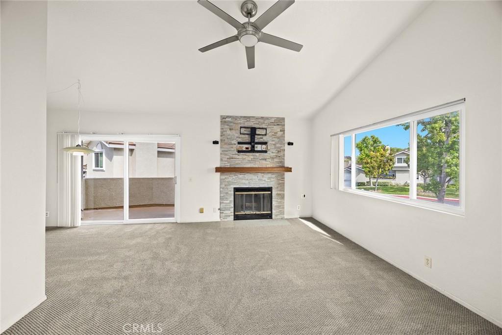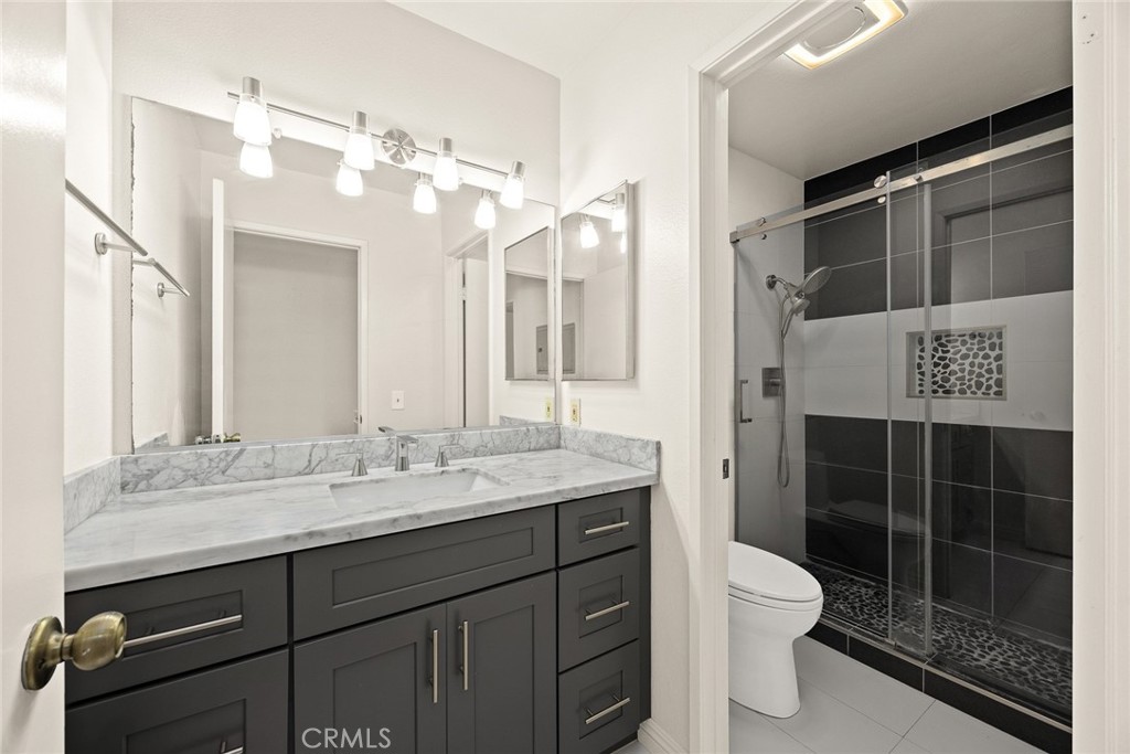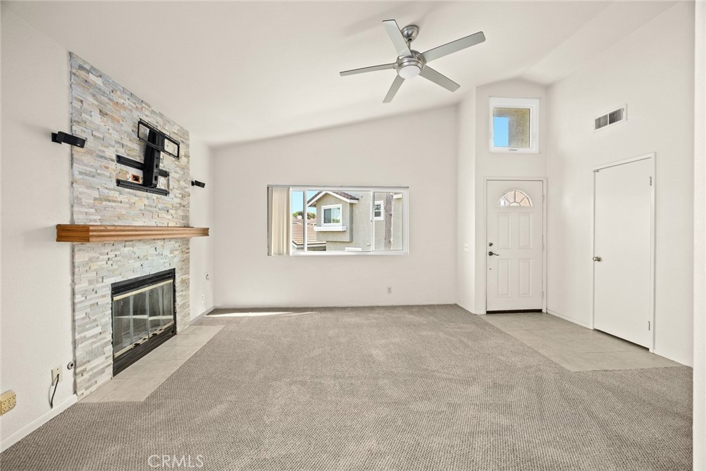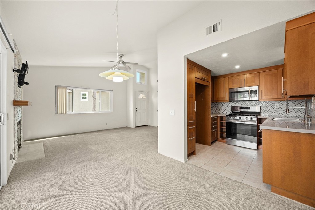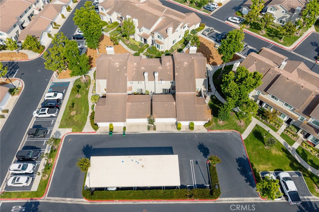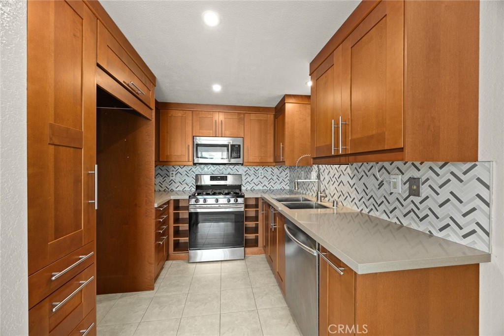 Welcome to Stonegate, located in the highly sought-after Woodbridge community of Irvine. This rare corner-unit Auburn model is bright and airy with beautiful greenbelt and treetop views from every room. Step into the spacious living room featuring vaulted ceilings and a cozy stone fireplace, flowing seamlessly into the formal dining area, which opens to a generous private balcony--perfect for relaxing or entertaining with stunning scenic views. The chef's kitchen is a standout, boasting custom cabinetry, quartz countertops, stylish tiled walls, stainless steel accents, and a host of thoughtful upgrades. The bedroom wing includes a dedicated laundry closet with side-by-side washer/dryer hookups. A remodeled bathroom showcases marble countertops, a custom vanity, and a private shower with stone and tile detailing, a custom showerhead, and a sleek sliding glass door. The primary bedroom is spacious, featuring vaulted ceilings, a ceiling fan, and an entire mirrored wardrobe wall. The second bedroom, ideal for guest or home office. Additional highlights include central air, a private garage (#549) with remote access, and a covered parking spot (#72), plus ample guest parking nearby. Enjoy all the award winning schools and the amenities of Woodbridge: scenic walking trails, lush parks, sparkling pools and spas, top-rated schools, and a wide range of sports facilities including tennis, volleyball, basketball, and handball courts. Plus, the community's stunning lake with mountain views adds a resort-style feel to everyday living.
